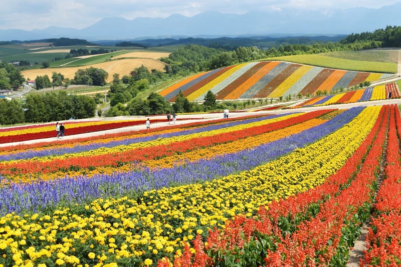 끝없이 펼쳐진 언덕 위, 붉은색과 노란색, 보라색이 조화롭게 춤추는 여름의 정원.마치 물감을 흘려놓은 듯한 이 풍경은 비에이의 대표 명소, 시키사이노오카에서 만날 수 있어요. 부드러운 곡선을 따라 피어난 꽃밭 사이로 산책하는 사람들의 실루엣이 더해지면, 그 자체가 한 편의 그림이 됩니다.